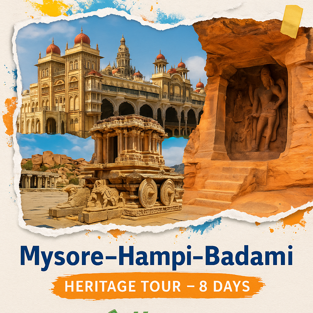 The Mysore–Hampi–Badami Heritage Tour is a remarkable exploration through Karnataka’s architectural marvels, royal palaces, and temple ruins that echo India’s glorious past. This 8-day journey immerses travelers in the grandeur of the Wodeyar dynasty, the mythological ruins of the Vijayanagara Empire, and the intricate rock-cut artistry of the Chalukya kings. Each stop along this route — from Mysore’s regal palaces to Hampi’s boulder-strewn landscapes and Badami’s cave sanctuaries — unveils layers of art, culture, and history that have shaped Southern India for centuries.